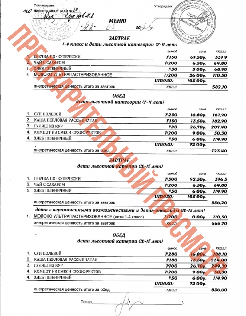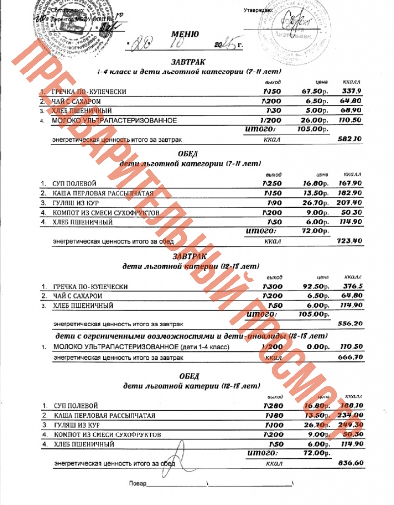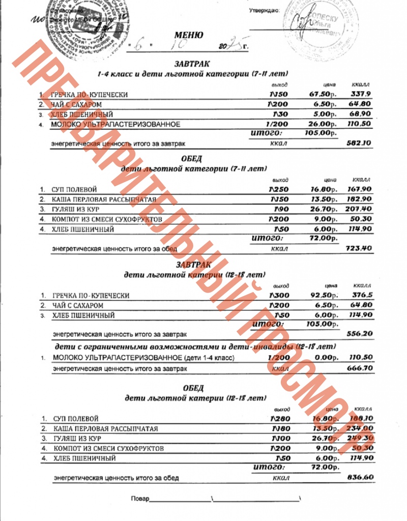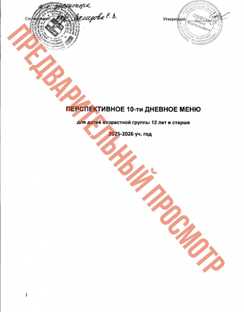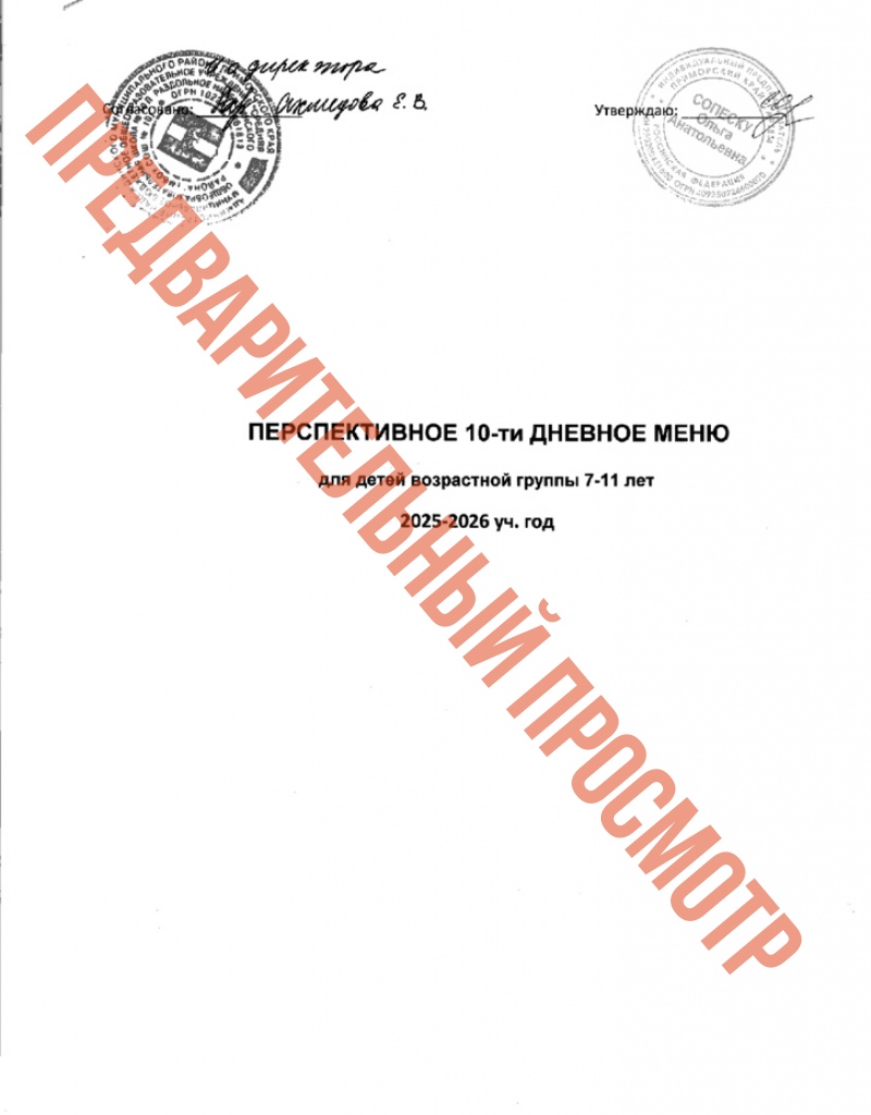Перспективное 10-ти дневное меню льготники 7-11 лет