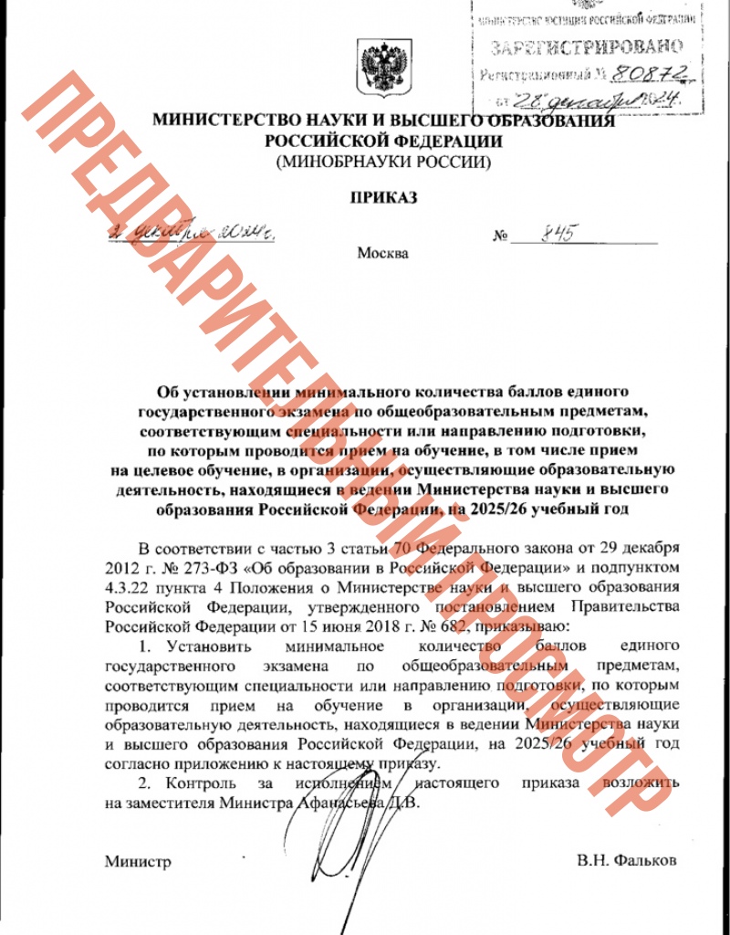 Приказ Министерства образования № 845 Об установлении минимального количества баллов на 2025-2026 учебный год